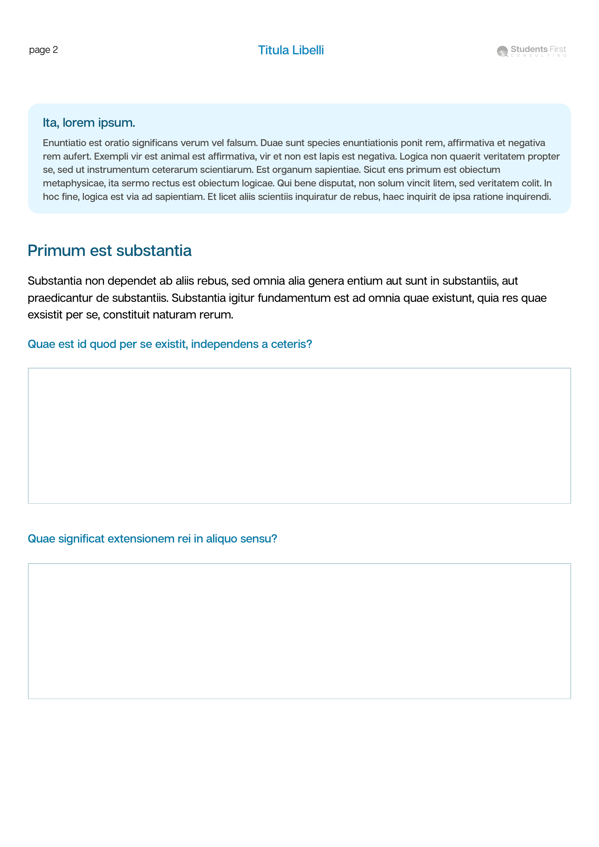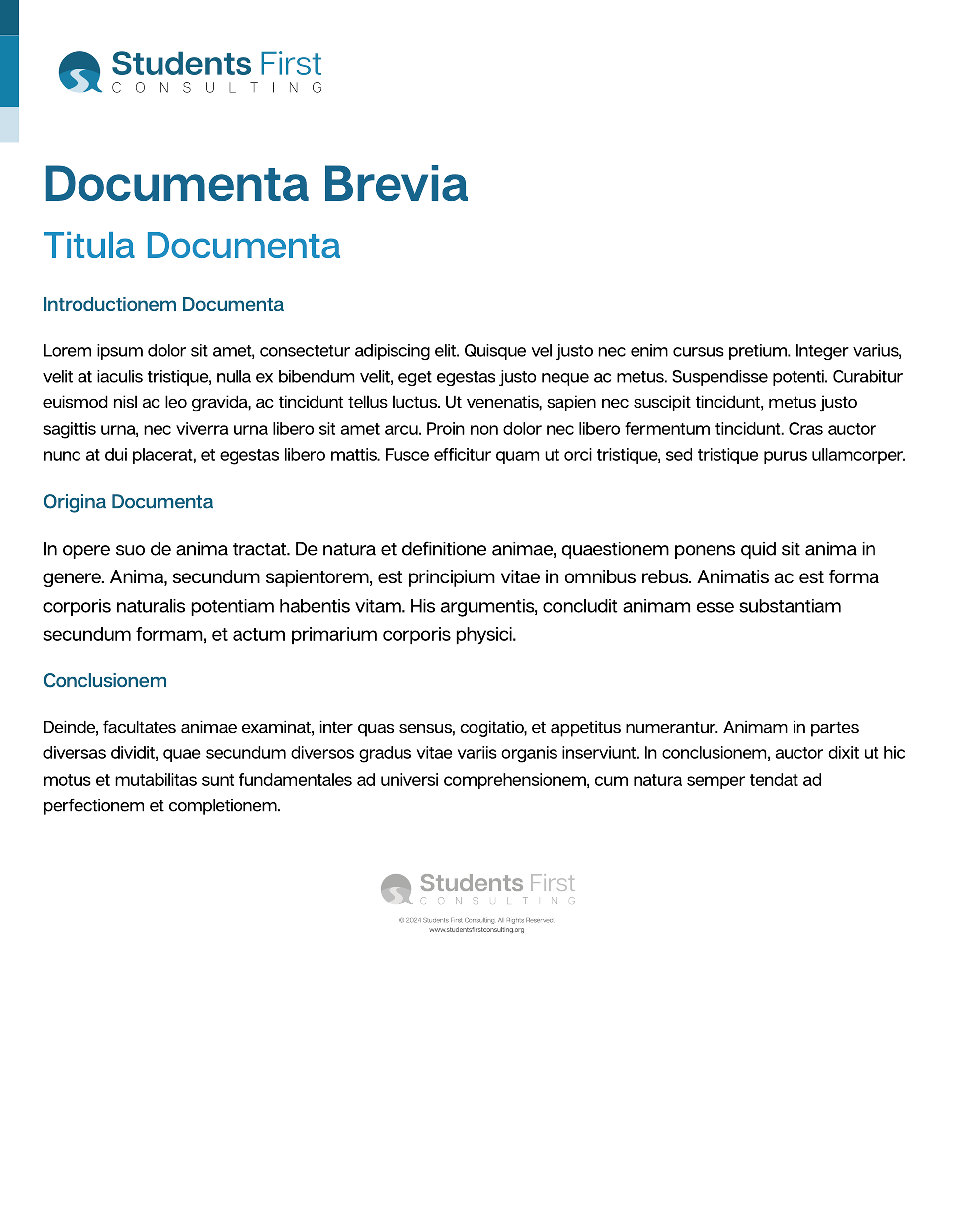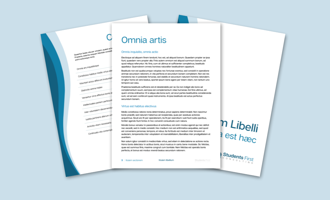 For Students First Consulting, I created a set of editable branded document templates, with elements they could reformat, reuse, and modify to create digital product offerings for their clients. I provided multiple styles for added visual interest, but ensured that each was consonant with their brand voice and existing assets.
